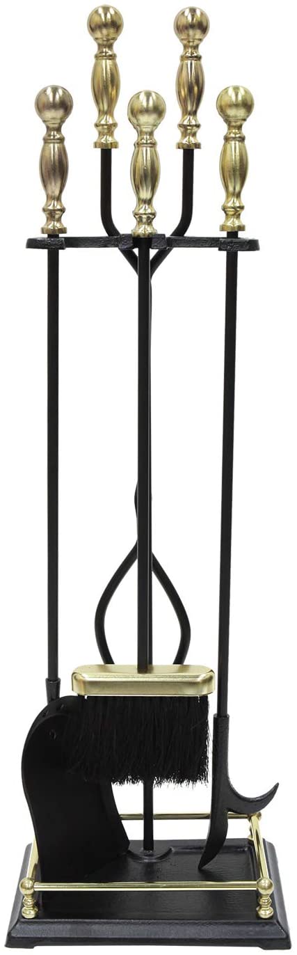Oakestry Oxford 5-Piece Fireplace Tool Set Outdoor Fireset Fire Pit Stand with Poker, Brush, Shovel, Tongs Enhancing Overall Appearance, Polished Brass and Black