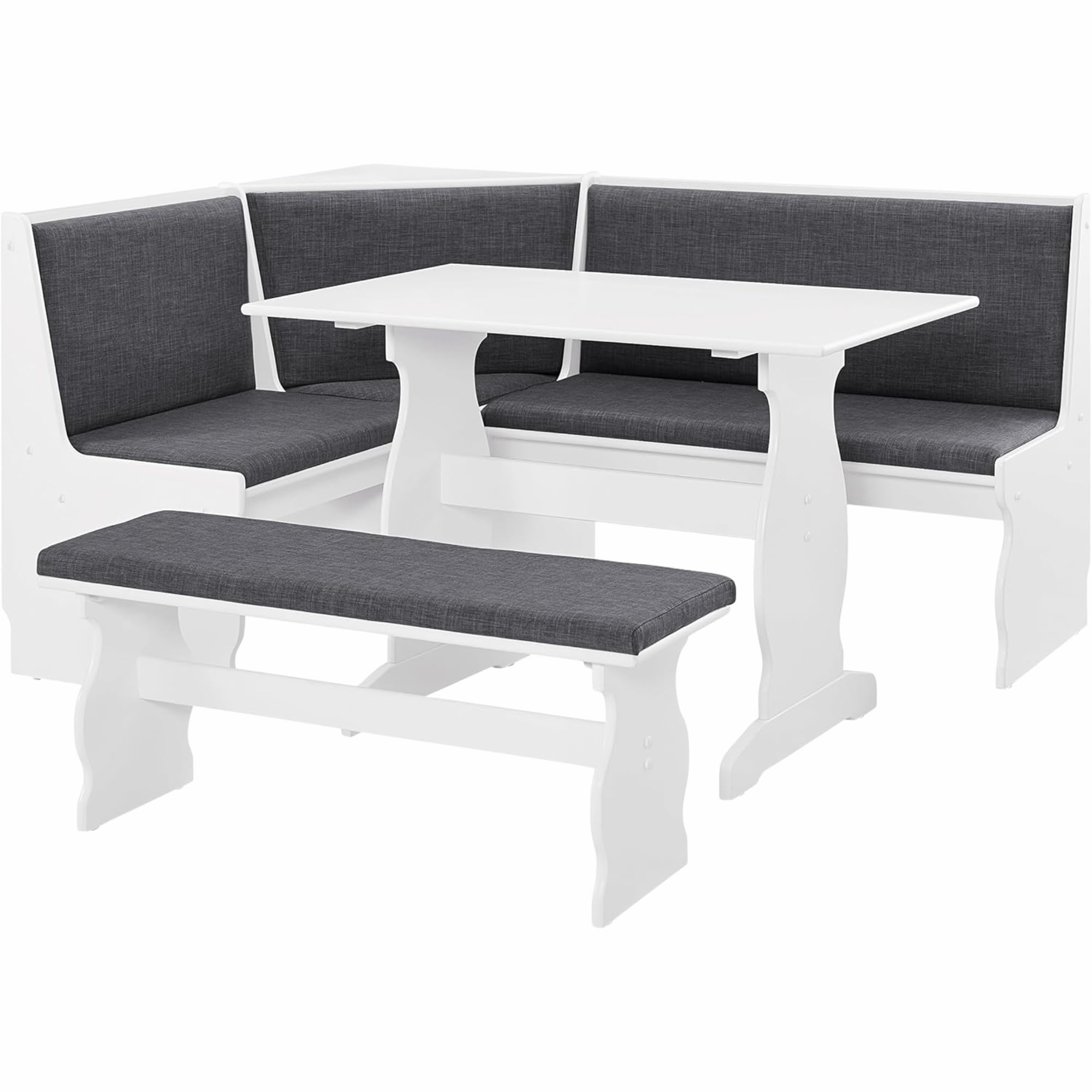 Modern–Traditional Style: Crisp white frame paired with charcoal upholstered seats creates a clean, updated look for any kitchen. Space-Saving Corner Design: Fits seamlessly into compact dining areas and comfortably seats up to five people. Durable Construction: Made from pine and...