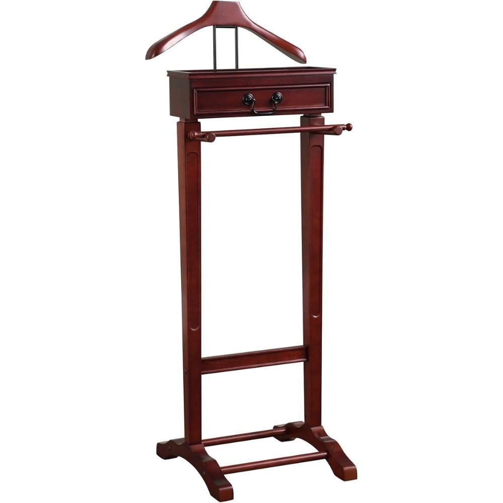 Oakestry Wooden Suit Valet Stand with Drawer Hanger Trouser Bar Shoe Rack Top Tray Luxury Wardrobe Organizer for Men Bedroom Office Mahogany