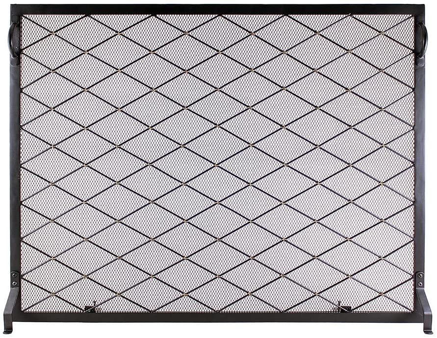 [" Diamond pattern screen with brass wire contrast accents, black wrought iron frame and mesh "," Measures 44-in W x 33-in H x 7 1\/4\"D at feet "," Adjustable back feet keep the screen level on an uneven hearth ","...
