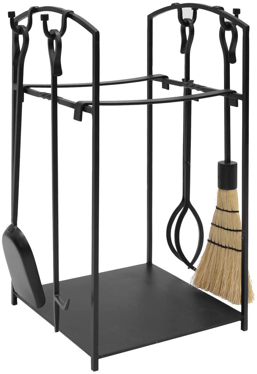 [" Mission style- Hand-forged in wrought iron, this Mission-style hearth center is sturdy, functional and keeps all your fire-tending needs in one place "," The four fireplace tools, Poker, Tongs, Shovel and Brush, are forged from square stock and hang from the log holder "," Store enough firewood for several cozy evenings on the lower shelf and kindling and newspaper on the upper shelf "," Measures 14-in square at base by 26-in H "," Powder coated in Black for a long-lasting durable finish "] Manufactured By : Minuteman International