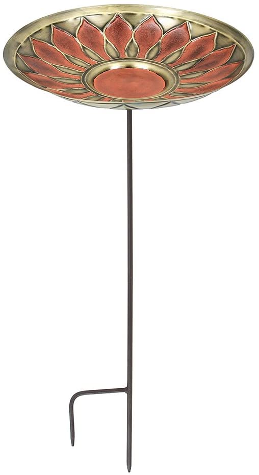 • 🐥 Hand-made: the bowl is formed from solid brass with an embossed design. Available in an antique brass finish or brass with Red patina finish. The bowl measures 16-in diameter. The underside of the bowl features a Threaded base that can be used with any of our birdbath stakes, stands or mounting brackets.