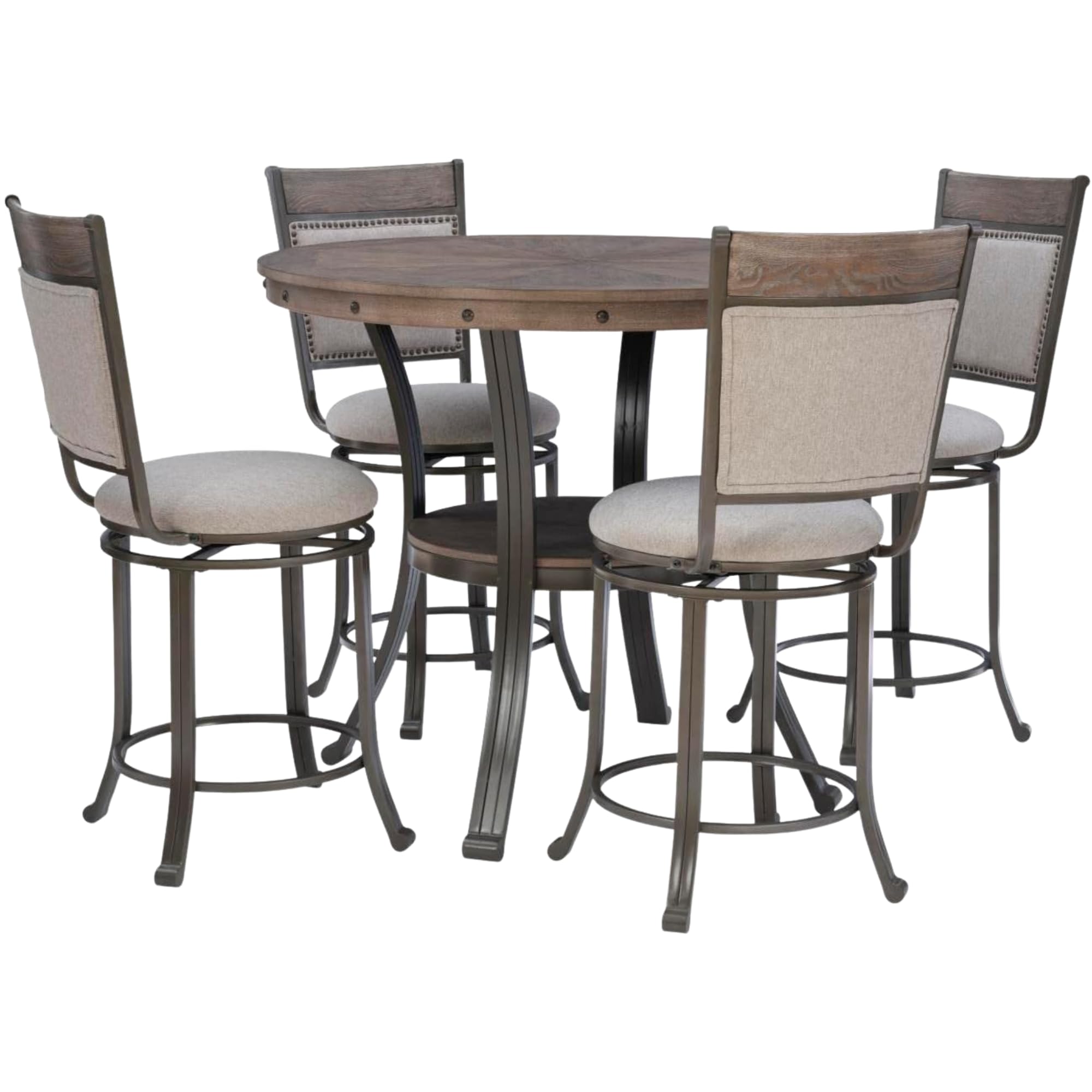 Oakestry Franklin 5-Piece Counter Height Dining Set with 42" Round Table & 360° Swivel Stools, Pewter Metal Base & Grey Ash Veneer Top